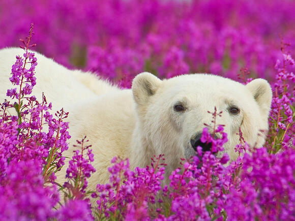 Играта на полярни мечки сред цветята