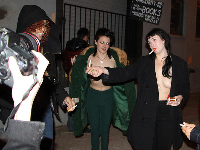 За тяхно щастие клубът заседава в Ню Йорк Сити, където законът е доста либерален и няма нищо против мъже и жени да ходят голи до кръста на открито, ако случайно така им се е приискало. В случая им