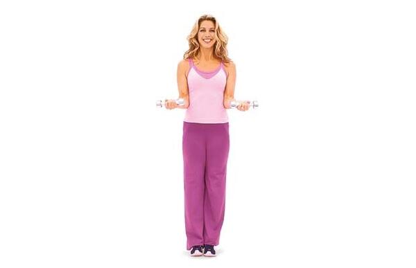 A. Застанете изправени със събрани крака. Вземете гирите в ръце и свийте лактите, така че така предмишниците да са успоредни на пода и дланите ви да сочат нагоре.