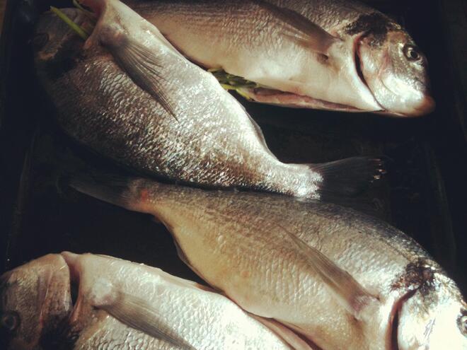 Поставете вътре парченца лимон, листенца магданоз, чесън – пресен или не. Всичко е на око и на вкус, пък и зависи колко са ви големи рибите.