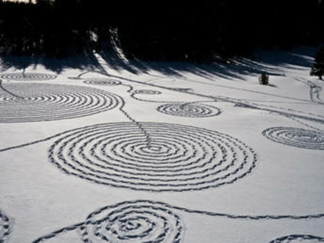 Казвам ви всичко това, за да обясня уважението си към хора, които не само, че не ги е страх, но и успяват да се вдъхновят от подобни атмосферни условия. Един от тях явно е Sonja Hinrichsen (не, не се наемам да го транскрибирам на български), която координира реализацията на проект под кодовото наименование Snow Circles. Въпросното дело явно е заемка от небезизвестните житни кръгове и изглежда не по-малко впечатляващо. Не за друго, ами защото включва немалък брой хора, които доброволно газят в снега.
